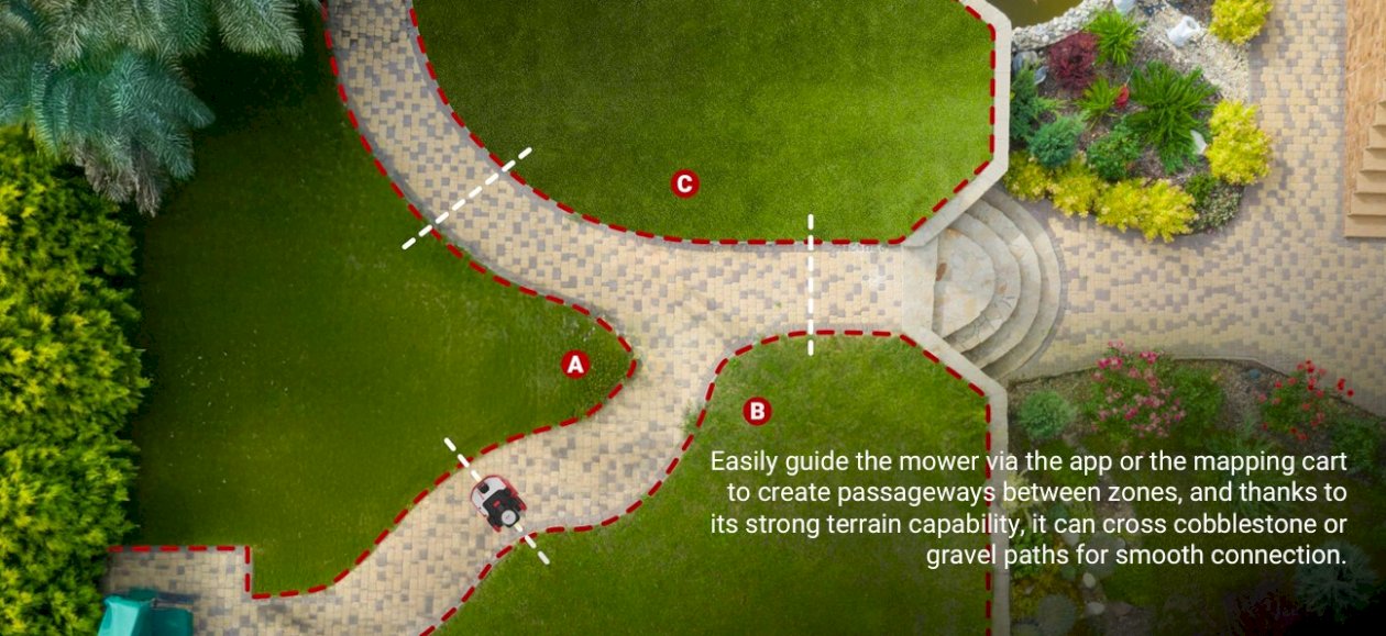 The mower can cross pathways such as cobblestone or gravel to connect multiple lawn areas smoothly and efficiently.