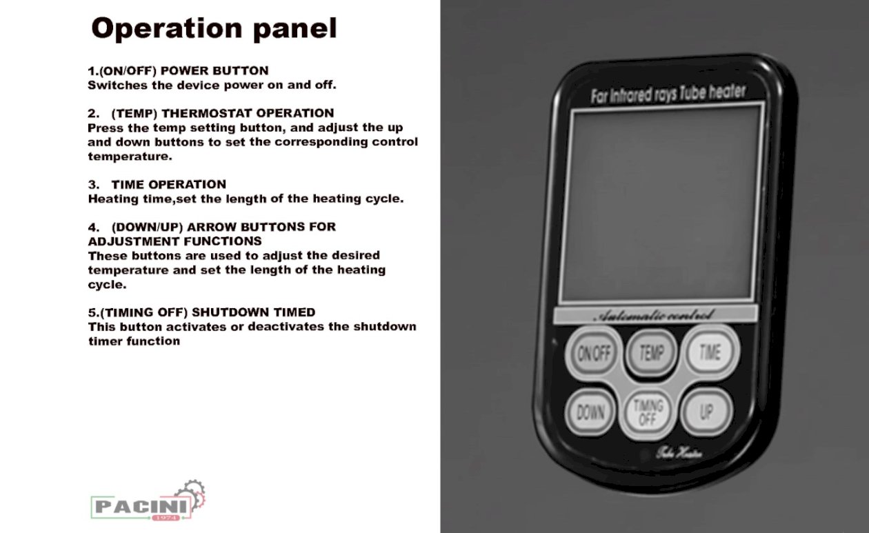 The Pacini 16KW Infrared Industrial Diesel Heater delivers high-quality, low-noise performance with efficient tubular burner technology. Designed with a simple touch-key control panel, it quickly cuts off residual fuel to prevent black smoke. Featuring a built-in ceramic honeycomb for cleaner combustion and a 24-hour timer, this heater provides powerful, reliable, and energy-efficient heating for industrial environments.