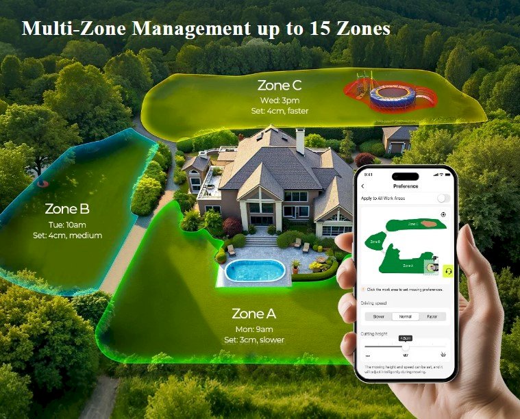 This smart robot mower maps your lawn using the mobile app, allowing you to create virtual boundaries, multi-zone mowing areas and no-go zones for complete control